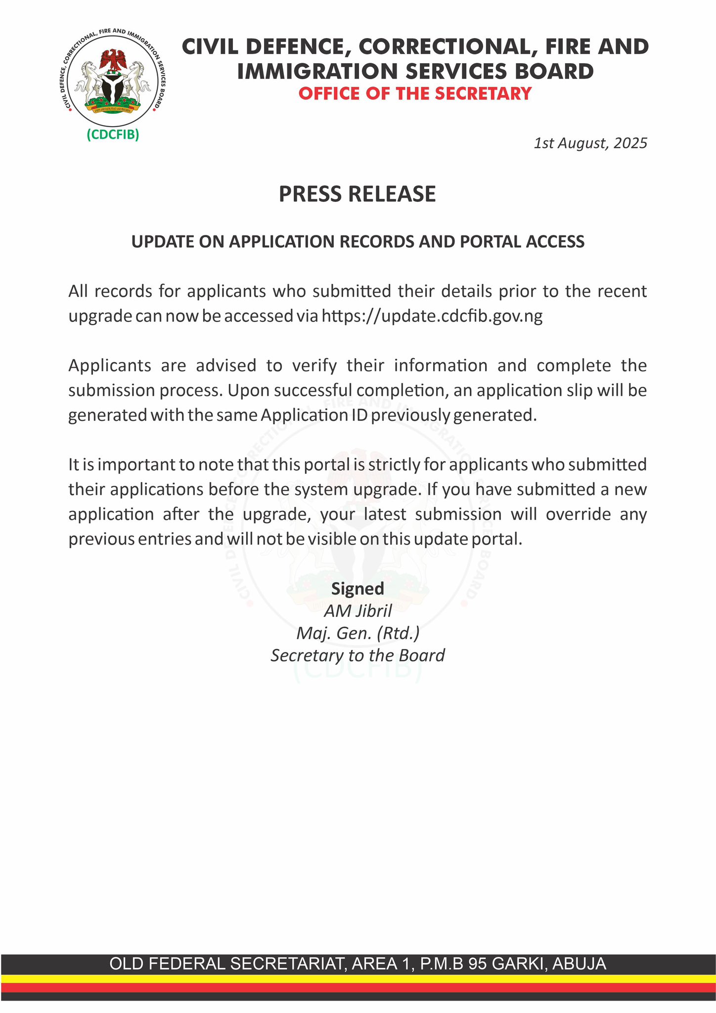 In a statement signed by Maj. Gen. (Rtd.) AM Jibril, Secretary to the Board, applicants who submitted their details before the upgrade can now access and correct their records via https://update.cdcfib.gov.ng.
